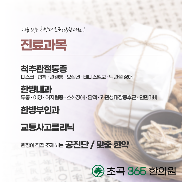 증상 개선과 호전된 상태가 지속될 수 있도록, 체질을 변화시키고 건강을 높이도록 한 분 한 분 정성을 다하는 초곡365한의원! 풍부한 임상경험과 노하우를 기반으로 증상을 개선하고 재발이 되지 않도록 치료에 임하고 있습니다. 대를 잇는 처방을 만나보실 수 있습니다. 365일 문이 열려있으니 편안한 시간에 내방하여 진료를 받으셔서 건강을 되찾아 보시길 바랍니다.