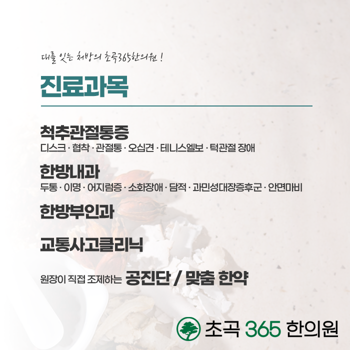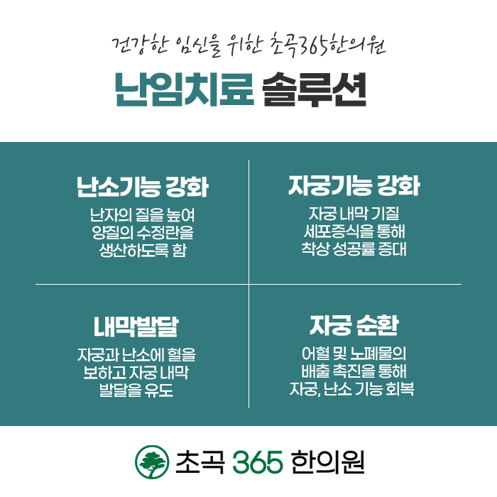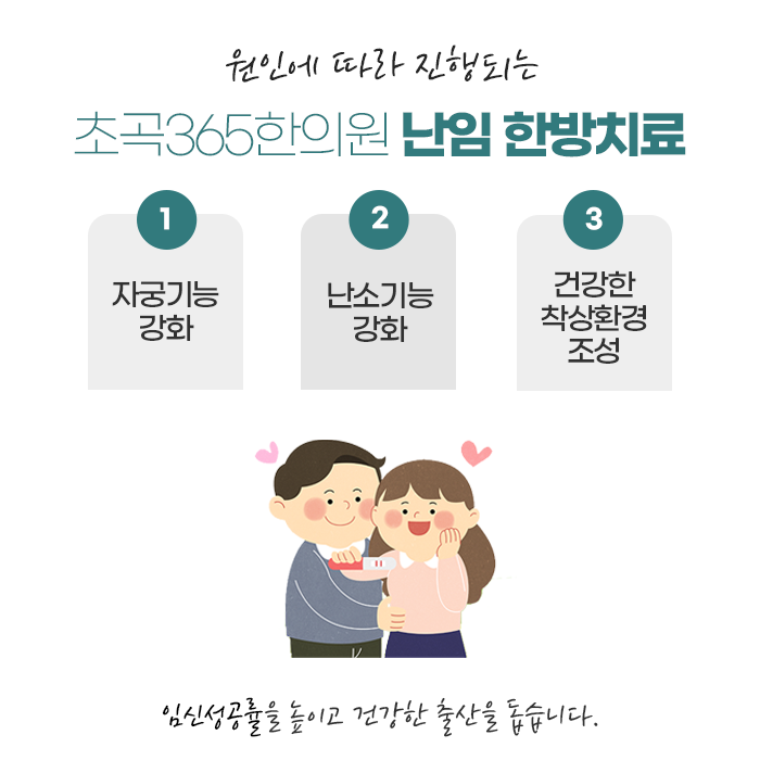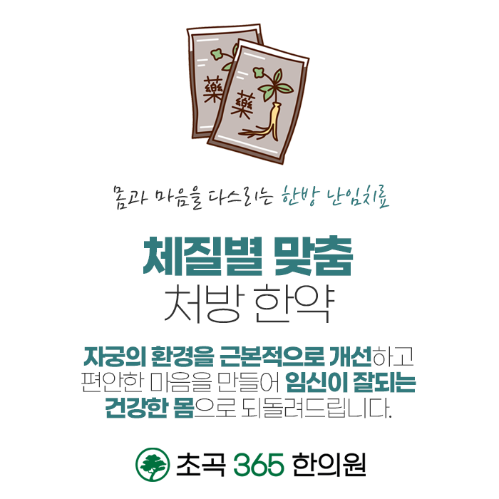 한방치료는 난임의 근본적인 문제를 개선하여 건강한 임신을 도와줍니다. 건강한 임신은 신체 외에도 마음의 건강도 매우 중요한데요. 기능적이 문제를 개선하고 체질 및 건강을 회복할 뿐만 아니라 마음의 안정까지 도와드리는 초곡365한의원! 풍부한 임상 경험과 노하우를 통하여 한방치료하고 있습니다. 한방케어를 통해서 난임의 원인이 되는 부분을 개선하고 임신에 성공하도록 도움을 받아보시길 바랍니다. 초곡365한의원은 한 분 한 분 정성을 다해 진료하고 있으며 365일 문이 여려있습니다. 편안하게 내원하여 충분하게 상담을 받고, 문진과 진맥을 통해서 체질에 따른 진료를 받아보시길 바랍니다.