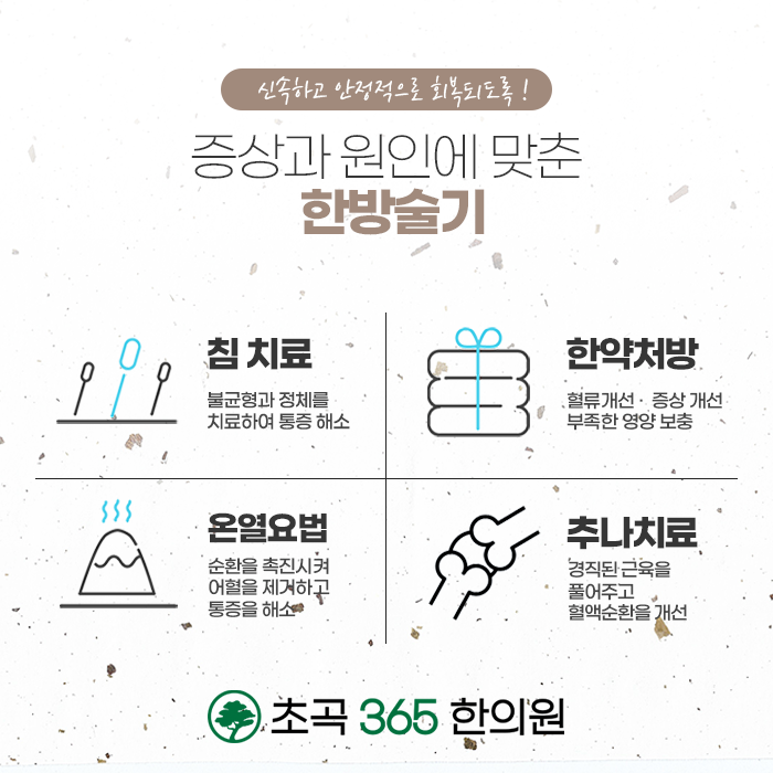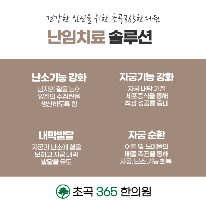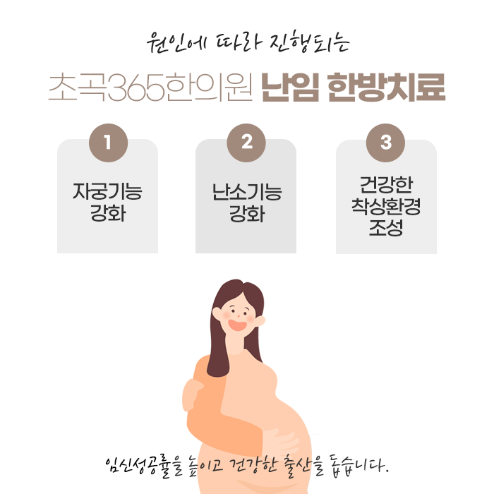 한방치료는 난임의 문제를 근본적으로 개선하여 건강한 임신을 도와드립니다. 건강하게 임신을 하려면 신체 외에도 마음의 건강이 중요합니다. 마음의 안정을 통하여 기능적인 문제를 개선해주고 체질 및 건강을 회복합니다. 풍부한 임상 경험과 노하우를 바탕하고 있는 초곡365한의원의 한방치료! 숙련된 한방 술기로 여러 가지 난임의 원인들을 개선하고 건강을 회복하며 임신에 성공하도록 한 분 한 분 정성을 다하여 진료합니다. 365일 진료가 가능하오니 편안한 시간에 내방하여 진료 받으시고 몸과 마음을 편안하게 안정화하여 보시길 바랍니다.