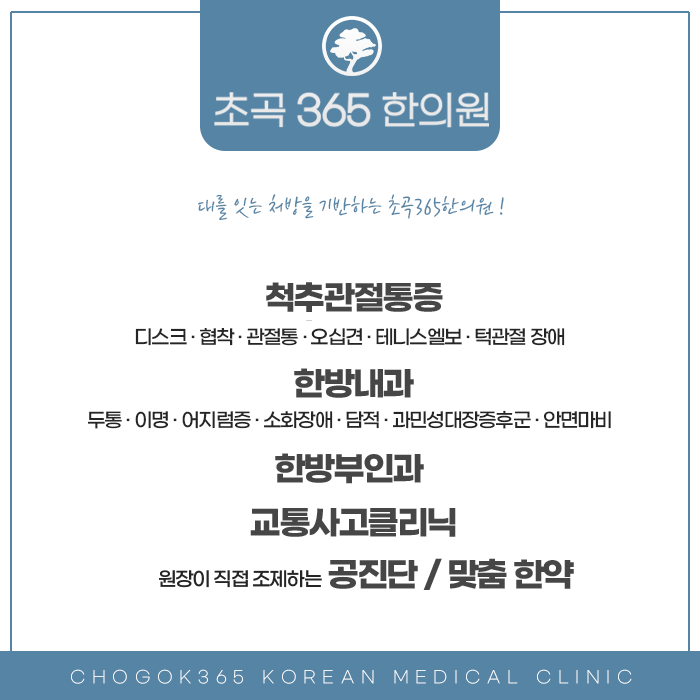 증상을 제대로 치료하지 않거나 방치하면 장기적인 문제로 발전될 수 있습니다. 그러므로 통증이 지속될 경우 적극적인 초기 치료가 필요합니다. 대를 잇는 처방을 바탕하고 있는 초곡365한의원에서는 완성된 한방 술기를 통해서 신속하고 안정적으로 증상을 개선하도록 도와드리고 있습니다. 건강하고 튼튼한 신체를 회복하고 편안한 일상을 회복하실 수 있도록 한 분 한 분 정성을 다하여 진료하고 있습니다. 365일 문이 열려있으니 편안하게 내방하여 진료를 받아보시길 바랍니다.