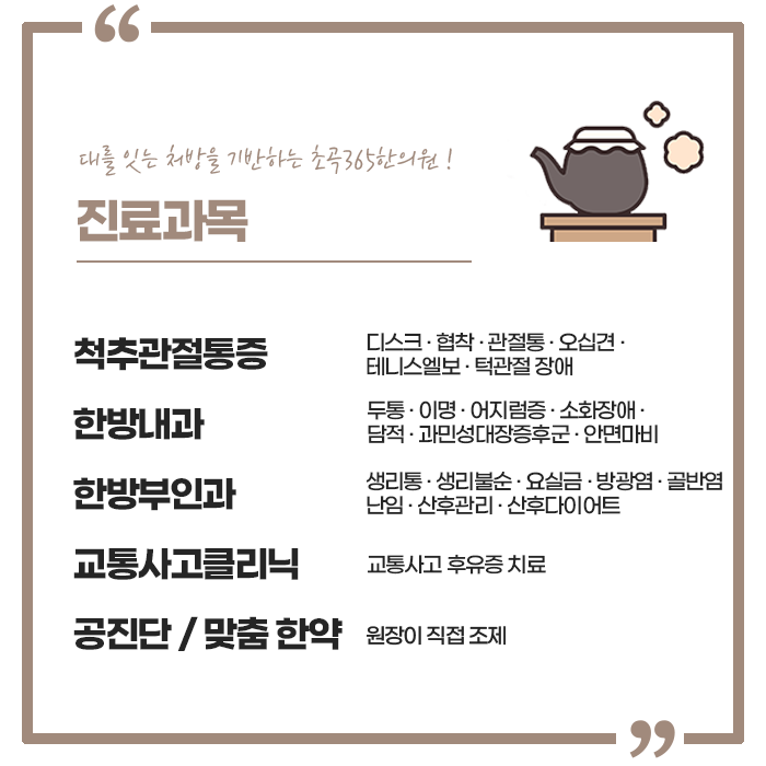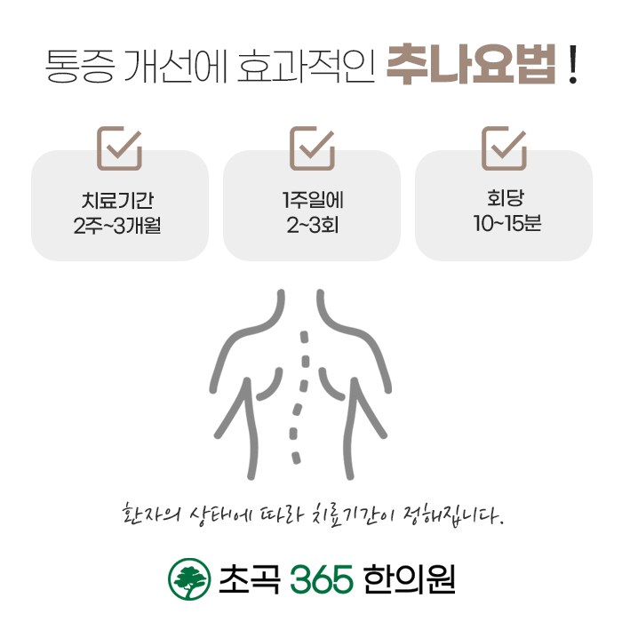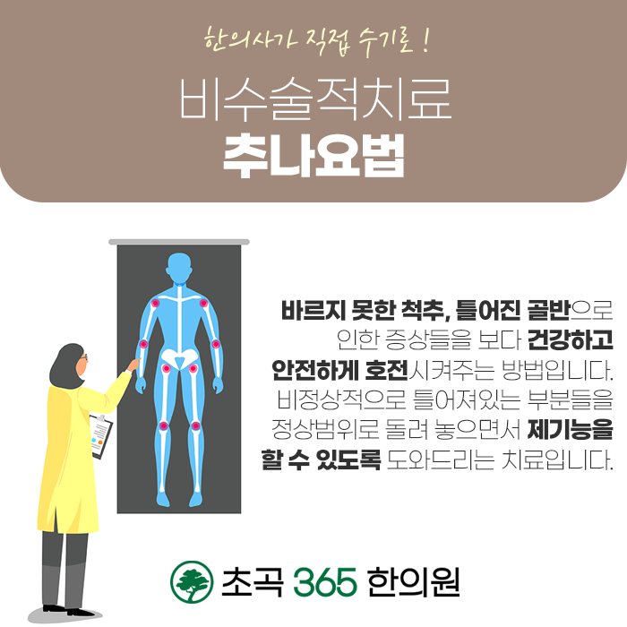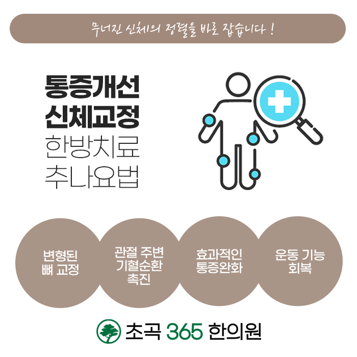 대를 잇는 처방을 기반하고 있는 초곡365한의원에서는 급성, 만성, 퇴행성으로 진행될 수 있는 통증을 개선하고 다양한 근골격계의 질환을 개선합니다. 추나요법은 치료 과정 혹은 치료 후의 부담이 적어 일상 속에서 편하게 치료가 가능합니다. 다양한 신체 부위의 통증, 불편함을 다스리는 초곡365한의원 추나치료 뿐만 아니라 다양한 한방 술기를를 통하여 불편함이나 통증을 개선하여 편안하고 건강한 신체를 회복하시길 바랍니다.