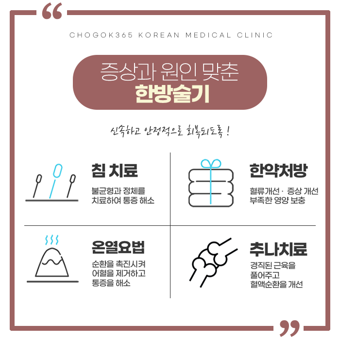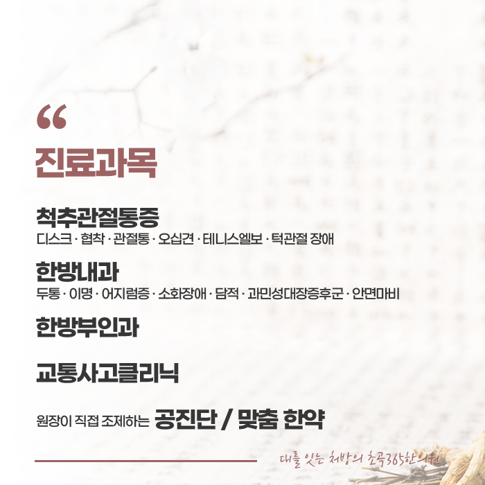 골반내의 면역력을 향상시키고 병적 이상 분비물을 완화해주는 초곡365한의원! 하복부의 분비물이나 불편함, 통증 등을 개선하는 한방 치료로 증상을 다스리고 재발을 예방해주고 체질을 개선합니다. 대를 잇는 처방을 바탕하고 있는 초곡365한의원의 체계적인 치료를 통하여 근본적인 원인을 개선하고 건강하고 편안한 일상을 찾아보시길 바랍니다. 충분하게 상담하고 진맥하여 한 분 한 분 정성으로 진료하고 365일 문이 열려있으니 편안한 시간에 방문하여 진료를 받아보시길 바랍니다.