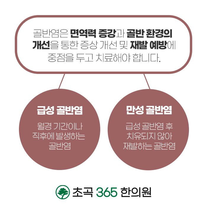 초곡365한의원의 골반염 한방치료는 자궁 면역력을 높이고 면역 체계를 안정화하도록 진료합니다. 스트레스, 과로, 무리한 다이어트 등으로 저하된 면역력은 질염 및 골반염을 유발하는 원인이 될 수 있으므로 염증이 재발되고 난임문제까지 확장될 수 있으므로 면역 체계를 안정화하는 것이 중요합니다. 염증 개선 뿐만 아니라 하복부의 순환을 개선해주어야 합니다. 개인 체질에 따라서 처방되는 1:1 맞춤 한약은 자궁의 면역력을 향상시키고 자궁 내의 어혈을 배출하여 제거합니다.