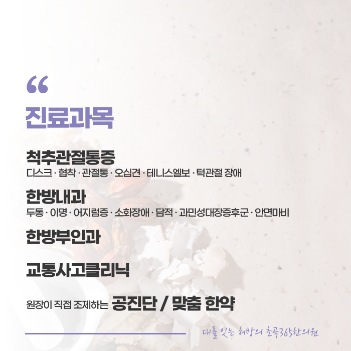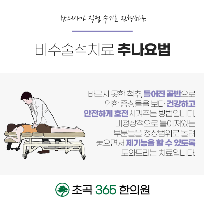 대를 잇는 처방을 기반하고 있는 초곡365한의원은 골반 교정을 위해 추나치료가 진행됩니다. 추나요법은 한의사가 직접 수기로 진행하는 치료로 근육, 관절을 밀고 당기는 과정을 통해서 척추와 골반의 통증이나 질환을 개선하여 줍니다. 바르지 못하고 비틀어진 신체를 개선해주고 안정적이고 신속하게 회복하여 줍니다.