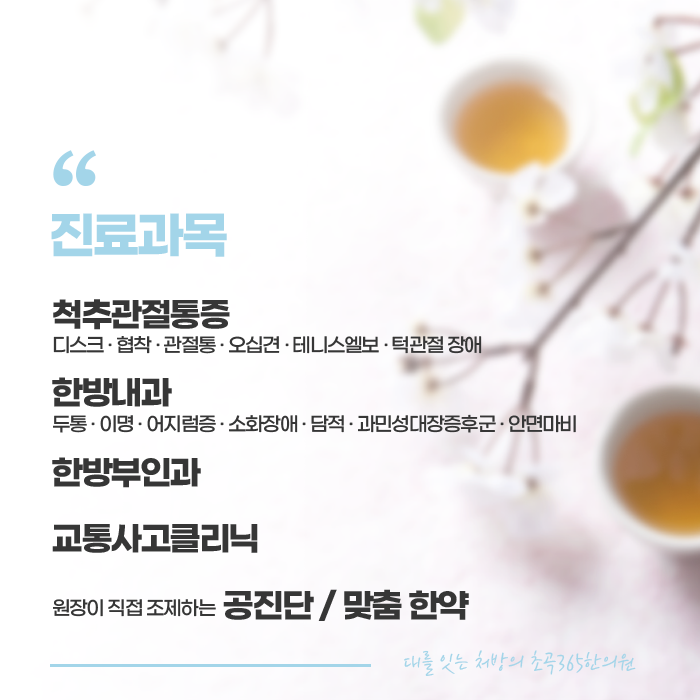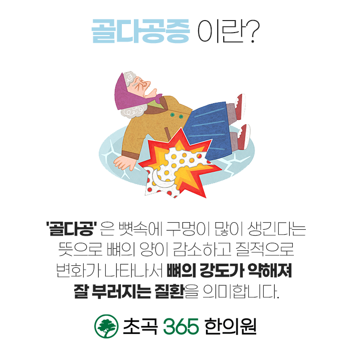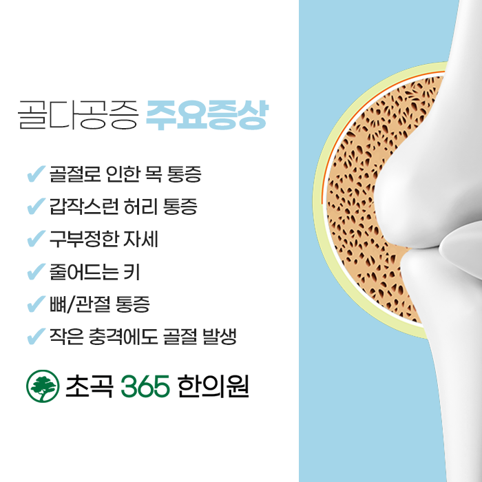 골다공증은 생활 관리가 무엇보다 중요합니다. 따라서 규칙적으로 생활하고 꾸준하게 운동하고, 비타민D를 충분하 보충하고 칼슘을 충분하게 섭취해주는 등 생활 속에서 꾸준하게 관리하여야 합니다. 칼슘을 과다하게 섭취하면 속이 불편해지고 소화가 잘 되지 않을 수 있으므로 소화기를 강화해준느 처방도 함께 진행되어야 합니다. 대를 잇는 처방을 기반하고 있는 초곡365한의원에서는 증상, 원인, 개인체질 등에 따른 1:1 솔루션을 제안해 드립니다. 숙련된 한방 술기와 생활 코칭으로 처방과 치료가 진행되고 있습니다. 한 분 한 분 정성을 다하여 진료하고 있는 초곡365한의원은 365일 진료가 가능하오니 편안한 시간에 내방하여 진료를 받으셔서 건강을 증진시키는데 도움을 받아보시길 바랍니다.