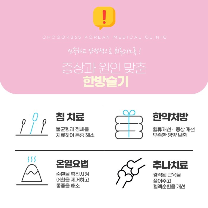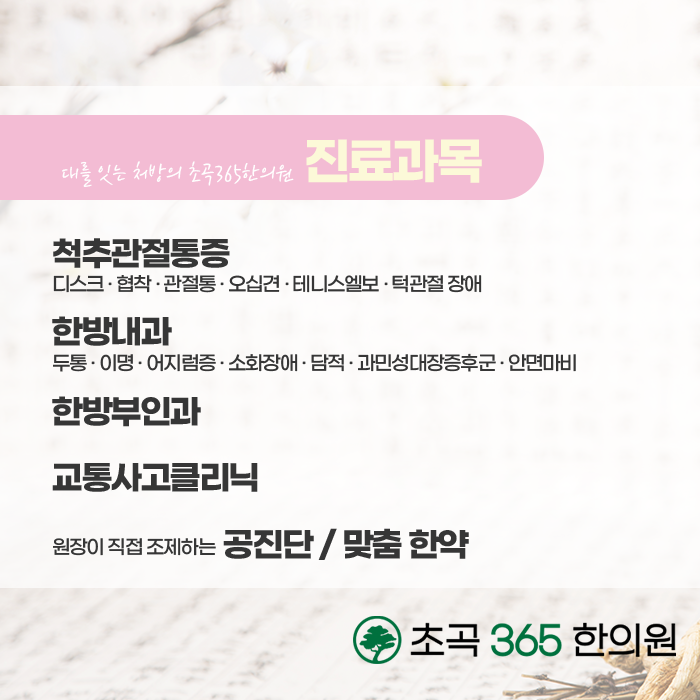 신체의 건강을 증진시켜 줄 뿐만 아니라 심리적인 안정화를 위한 치료도 필요합니다. 안산리본한의원은 맞춤 처방을 통하여 후유증을 다스리고 건강을 회복하실 수 있도록 한 분 한 분 정성으로 진료하고 있습니다. 건강 상태, 개인 체질 등에 맞춘 솔루션으로 진행되고, 한약은 식약처로부터 인증을 받은 한약재만을 사용하고 위생적인 관리하에 처방이 이루어지고 있습니다. 대를 잇는 처방을 만나보실 수 있는 초곡365한의원에서는 건강을 증진시킬 뿐만 아니라 향후 임신과 출산에도 좋은 영향을 줄 수 있도록 체계적으로 진행됩니다. 365일 진료가 가능하오니 편안한 시간에 내방하여 진료받아 보시길 바랍니다.