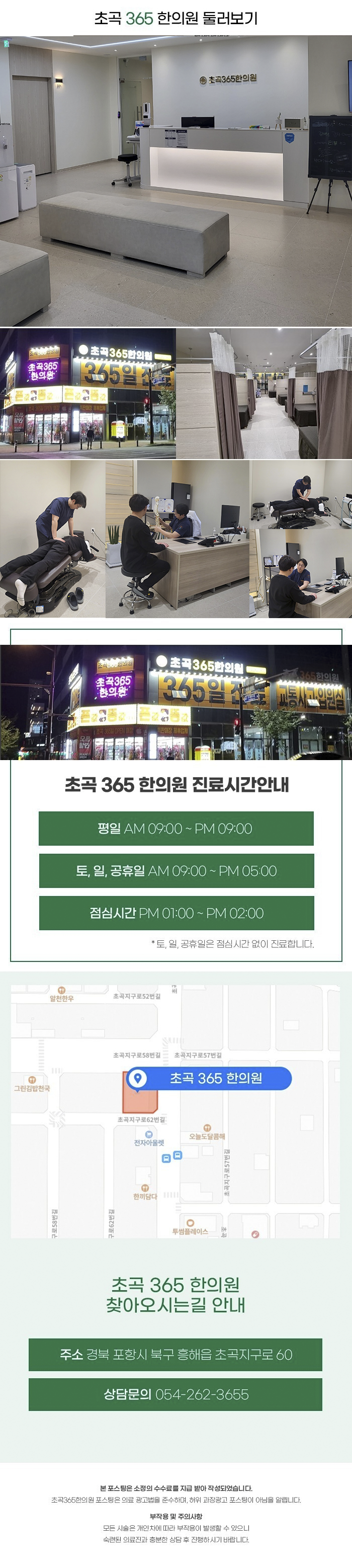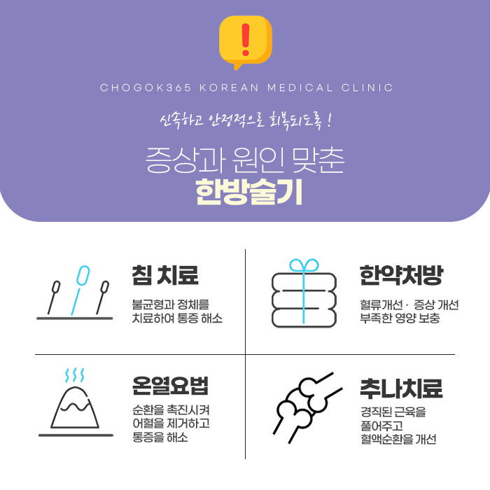 비틀어지고 바르지 못한 경추 및 척추로 인한 통증이나 문제점을 개선하고 신속하고 안정적으로 회복될 수 있게 도와드립니다. 대를 잇는 처방을 바탕하고 있는 초곡365한의원의 도움을 받아서 비틀어지고 불균형한 신체를 바로 잡아주고 제기능을 회복하여 정상적인 범위로 되돌려야 합니다. 365일 진료가 가능하오니 편안한 시간에 내방하여 진료받아보시길 바랍니다.