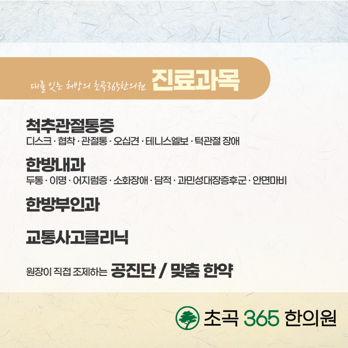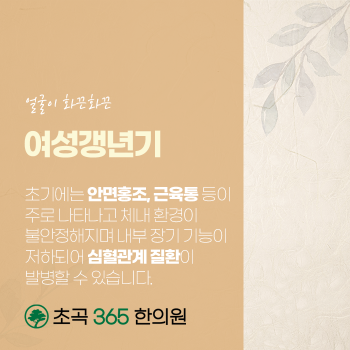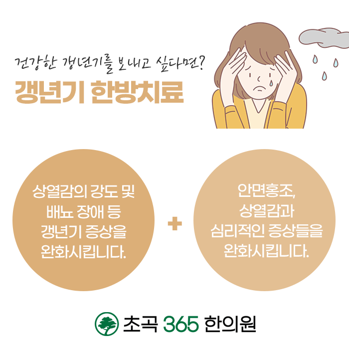 갱년기는 여성이라면 피해갈 수 없는 시기인만큼 바른 관리가 필요합니다. 시간이 지나도 호전이 되지 않고 증상이 점점 심해진다면 합병증까지 발전될 수 있습니다. 무작정 시간이 지나면 괜찮아지겠지, 라고 여기지 마시고 바른 해결책을 찾아야 합니다. 편안한 갱년기를 보내도록 도와드리는 초곡365한의원 통해서 증상을 다스리고 지혜롭고 혀명하게 극복하여 편안하고 건강한 일상을 되찾으시길 바랍니다.