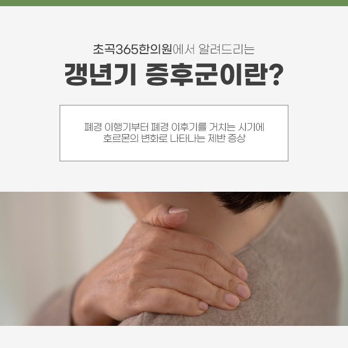 안녕하세요. 최선의 치료로 교통사고 이후의 후유증을 빠르게 다스리는 한의원, 초곡365한의원입니다. 갱년기는 남성 여성 모두에게 나타날 수 있는 생리적인 변화입니다. 노화에 따라서 신체 기능이 하나 둘 저하되면서 호르몬의 균형이 무너져 나타나는 증상들을 갱년기 증후군이라고 하는데요.