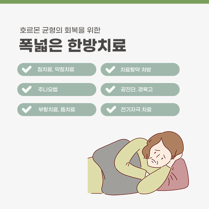 기혈의 흐름이 변화되고 호르몬 균형이 무너지게 되면서 전반적인 건강 상태가 악화되는 것입니다. 따라서 초곡 연휴한의원에 오셔서 신체 기혈 순환을 원활하게 하고 장부의 건강을 회복시키는 것이 바람직하겠습니다. 본원에서는 궁극적으로 면역력을 높이고 호르몬의 밸런스를 정상화합니다.