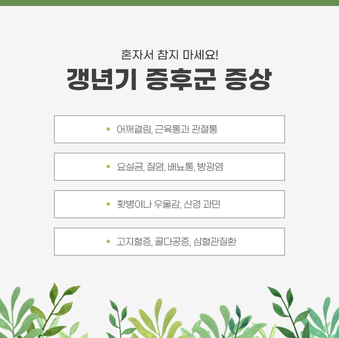 이렇게 갱년기 동안에는 굉장히 다양한 증상들이 동반될 수가 있으며, 개인에 따라서 나타나는 증상이나 시기가 달라지곤 합니다. 특히나 기존에 기저질환 및 만성질환을 가지고 있었던 분들이라면 증상이 더더욱 심해져 삶의 질이 떨어지게 됩니다.