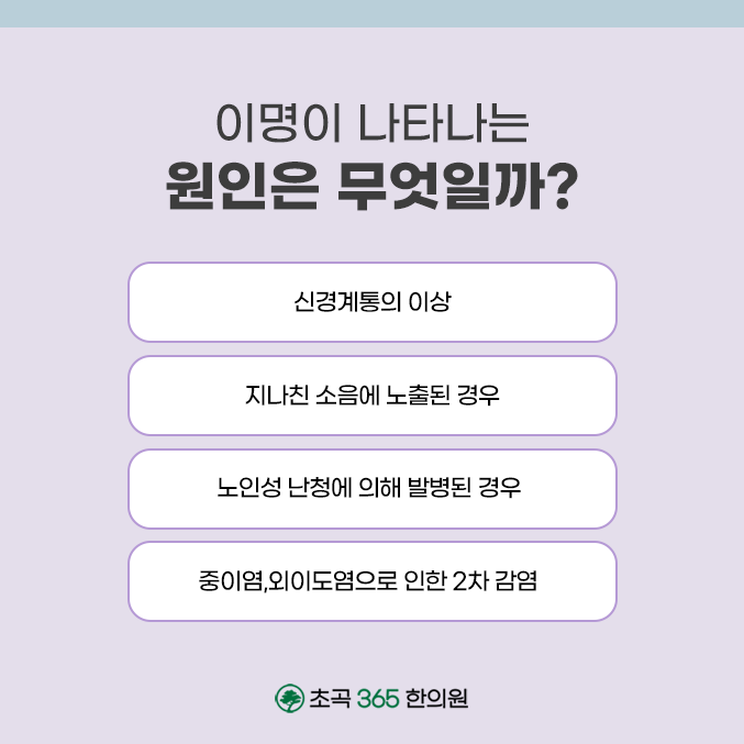 일반적으로 삐~하는 전자음 소리가 들리곤 하는데, 개인에 따라서는 물흐르는 소리나 바람 소리, 매미소리, 기차 소리 등으로 표현하시는 분들도 계십니다. 이명 증상은 단순히 귀의 문제로만 끝나는 것이 아니라 뇌의 반응이나 심리적인 문제, 또는 만성피로 증후군으로도 발전을 할 수가 있습니다.