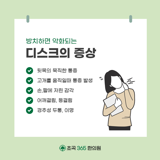 이렇게 목디스크는 목의 아픔 뿐만 아니라 팔과 손까지 방사통을 부르구요. 또 경추의 배열이 틀어지다보니 혈액순환이 제대로 이루어지지 않아 내과적인 증상들이 함께 나타나게 됩니다. 이렇게 목디스크가 호발한 후에 여러 형태의 증세가 복합적으로 동반될 수 있기에 포항흥해 공휴일한의원에서 적절한 조치를 취하고 신체의 밸런스를 바로 잡아나가야겠습니다.