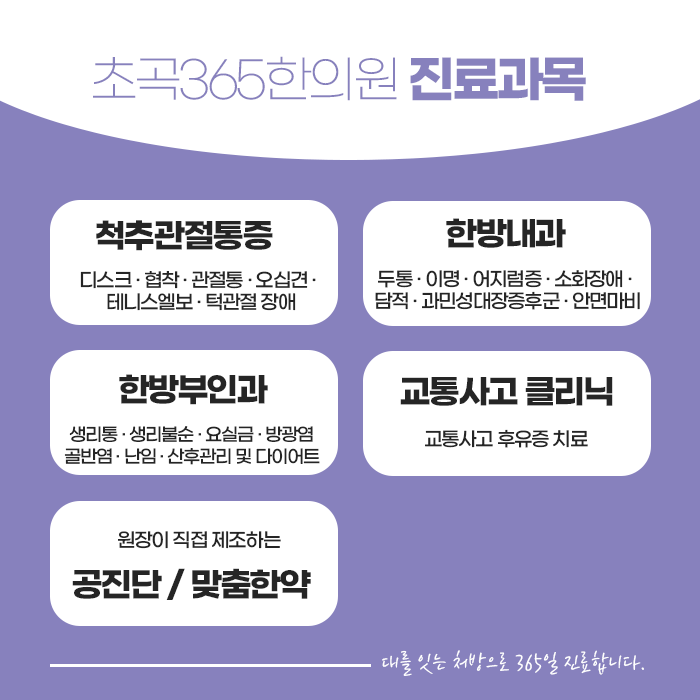 평소 알레르기 증상이 반복된다면, 코의 문제만이 아니라 면역 체계의 균형이 깨졌다는 신호일 수 있습니다. 한 분 한 분 정성을 다하여 진료하고 있는 초곡365한의원은 바쁜 현대인들을 위해 야간 진료와 주말 진료도 가능하여 편리한 시간에 방문하실 수 있습니다. 보다 건강한 삶을 위해, 반복되는 알레르기 증상에 지치셨다면 지금 바로 포항 알레르기 한의원 한방 치료를 경험해 보시길 바랍니다. 증상 개선은 물론, 건강한 체질로 변화시켜주어 보다 근본적인 회복을 도와드리겠습니다.