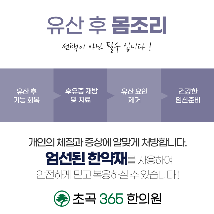 유산은 몸과 마음 모두에게 상처가 되는 과정이지만, 올바른 치료와 조리 과정을 통해 건강한 회복은 물론 새로운 희망을 준비할 수 있습니다. 유산 후 불편한 증상이 없다고 방심하지 마시고, 포항 유산후한의원에서 건강하고 균형 잡힌 회복을 시작해보세요. 초곡365한의원은 한 분 한 분의 몸과 마음에 정성을 다해 진료하며, 유산 후 건강 회복은 물론 향후 건강한 임신을 준비하실 수 있도록 적극적으로 도와드리고 있습니다. 몸과 마음이 함께 치유될 수 있도록 도움을 받아보시길 바랍니다.