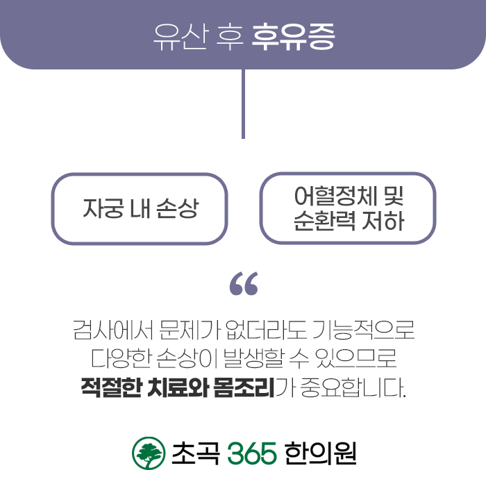 바쁜 현대 여성들은 일상에 복귀하기 위해 회복 시간을 충분히 갖지 못하는 경우가 많습니다. 그러나 아무 증상이 없다 하더라도 몸 안에서는 여전히 어혈과 노폐물이 남아있고, 자궁 기능이 저하된 상태일 수 있습니다. 눈에 보이는 증상이 없다고 해서 건강이 회복된 것은 아니며, 이후 생리 이상, 골반 통증, 피로감 등 다양한 후유증이 뒤늦게 나타날 수 있기 때문에 유산 후 관리에 더욱 주의를 기울여야 합니다.