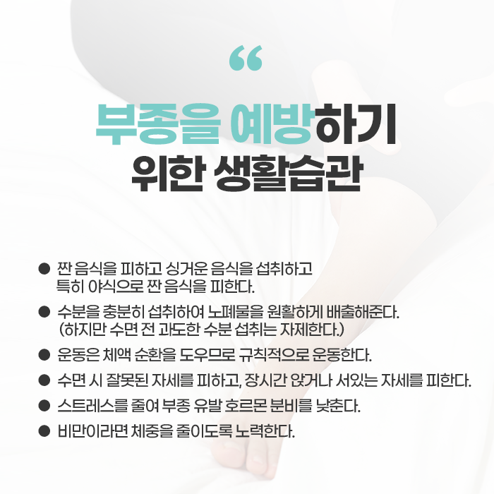 주로 수면 중 수분 대사의 균형이 깨질 때 생깁니다. 이 밖에도 간, 신장, 심장 기능이 저하될 때 전신에 걸쳐 부종이 생길 수 있습니다. 이는 경고 신호이므로 빠른 진료가 필요합니다. 부종은 단지 미용적 문제를 넘어서 심하면 무거움, 통증, 저림, 움직임의 제한을 유발할 수 있으며, 만성 부종은 피부 변색이나 궤양 등의 2차 질환을 유발하기도 합니다.