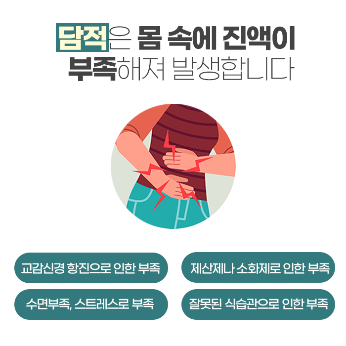정밀 검사에서 특별한 이상이 발견되지 않더라도 증상이 계속되는 경우가 있습니다. 이런 경우에는 한의학에서 이야기하는 ‘담적(痰積)’을 의심해 볼 수 있습니다. 담적은 몸속 노폐물이 위장 외벽에 축적되어 위장 기능을 떨어뜨리는 현상으로, 식사 후 더부룩함, 트림, 속쓰림, 소화불량, 만성 피로감, 어지럼증 등을 유발합니다.