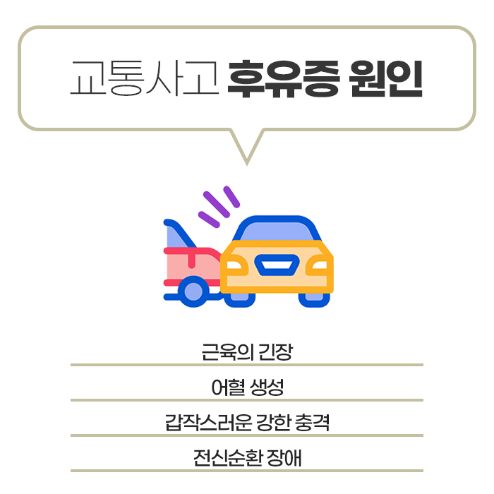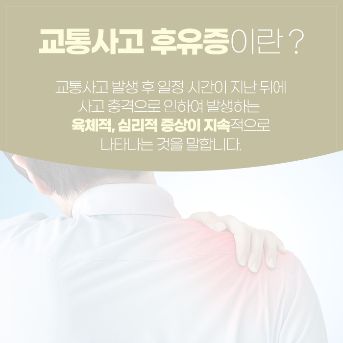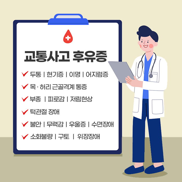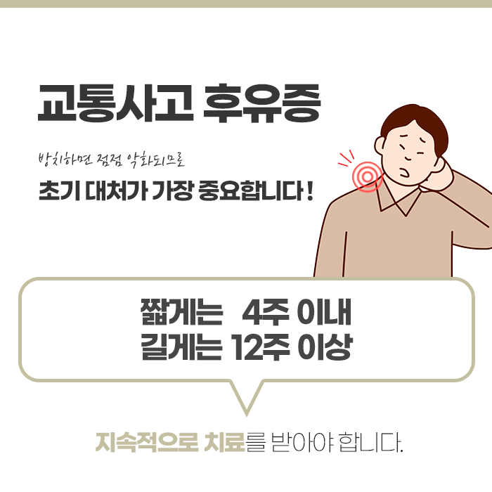 교통사고는 사소한 접촉사고라고 해도 우리 몸에 큰 충격을 주어 예상치 못한 다양한 후유증을 초래할 수 있습니다. 그렇기 때문에 사고 직후 특별한 이상이 없어 보여도 신체와 마음 모두 세심한 관리가 필요합니다. 사고 순간 우리 몸은 강한 스트레스에 대응하기 위해 아드레날린, 코르티솔 등의 호르몬을 분비해 통증을 일시적으로 억제합니다. 이로 인해 사고 직후에는 통증이나 불편감을 바로 느끼지 못하고, 며칠 혹은 수주가 지난 뒤에야 증상이 나타나는 경우가 많습니다.