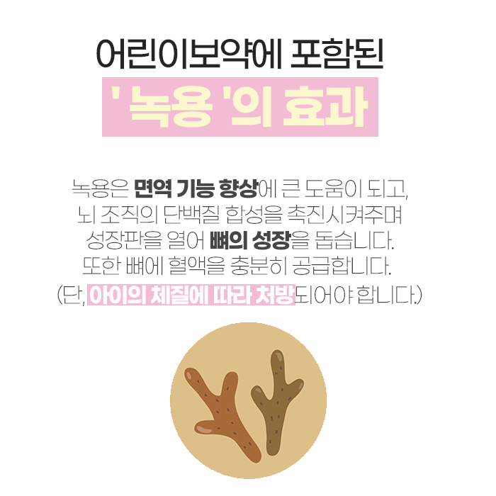 녹용은 성장기 보약으로 잘 알려진 대표적인 약재입니다. 특히 체력이 약하거나 자주 피로를 느끼는 아이들에게 많이 활용되며, 혈액순환을 도와 심폐 기능을 강화시키고, 식욕을 증진시키며 수면의 질 향상에도 도움을 줄 수 있습니다. 또한 녹용은 근육과 뼈의 형성을 촉진하고 회복력을 높이는 데도 효과가 있어, 병후 회복기나 허약 체질의 아이들에게 긍정적인 결과를 기대할 수 있습니다.