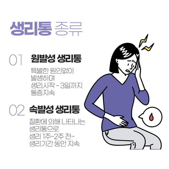 자궁이 수축하면서 통증을 유발하는 것으로, 자궁 내막에서 분비되는 프로스타글란딘이라는 물질이 자궁 수축을 유도하고, 이로 인해 혈류가 감소하면서 통증이 발생합니다. 프로스타글란딘 분비가 많을수록 통증도 심해질 수 있습니다. 2차성 생리통은 자궁이나 난소 등의 장기에서 발생하는 질환으로 인해 생기는 통증입니다.