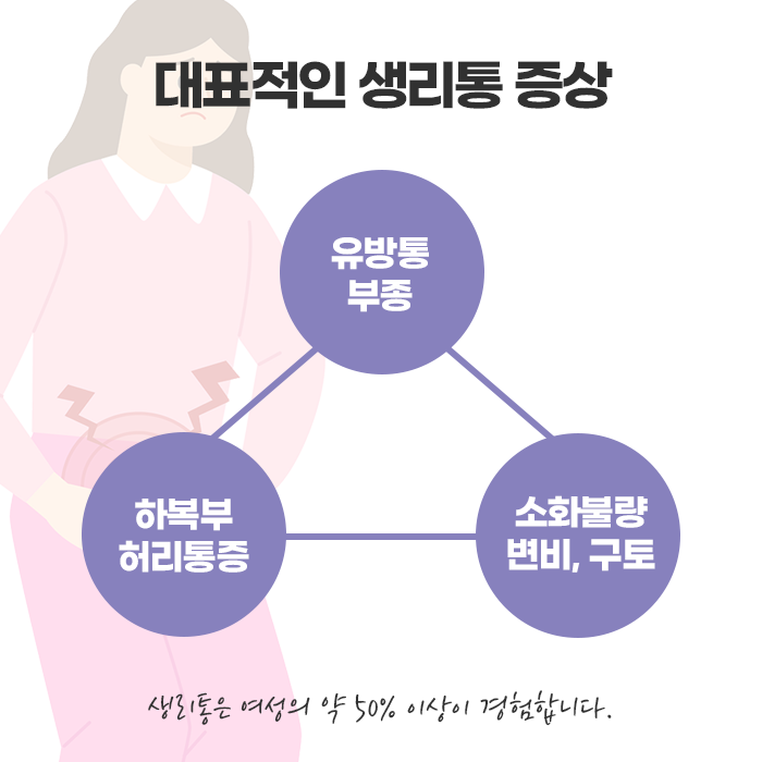 생리통의 증상은 다양하게 나타납니다. 가장 흔한 증상은 아랫배 통증이며, 통증이 허리나 허벅지 안쪽으로 퍼지기도 합니다. 경련처럼 쥐어짜는 듯한 통증이 특징적이며, 속이 메스껍거나 구토를 유발할 수 있고, 두통, 어지럼증, 피로감, 설사, 소화불량, 가슴통증 등을 동반하기도 합니다. 심한 경우 일상생활이나 학업, 업무에 지장을 줄 정도로 고통스럽게 느껴질 수 있으며, 이러한 상태가 매달 반복된다면 삶의 질 저하로 이어지게 됩니다.
