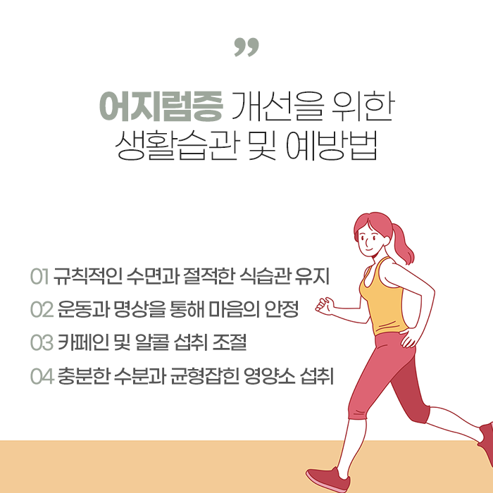 카페인이나 술은 자율신경을 자극해 어지럼을 악화시킬 수 있으므로 섭취를 줄이는 것이 좋고, 스트레스 관리를 위해 명상이나 심호흡, 가벼운 운동 등을 생활 속에 도입하는 것도 도움이 됩니다. 요가나 스트레칭 등은 몸의 균형을 유지하고 혈류를 원활하게 하는 데 효과가 있어 어지럼증 완화에 도움을 줄 수 있습니다.