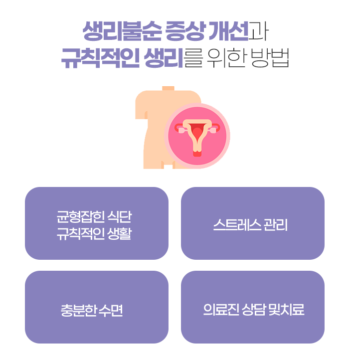 스트레스를 줄이고, 정신적 안정을 위한 명상이나 가벼운 산책, 취미 활동 등을 병행하는 것도 도움이 됩니다. 생리불순 치료는 원인에 따라 다르게 접근해야 합니다. 구조적인 문제가 있는 경우에는 해당 질환을 먼저 치료하는 것이 우선이며, 기능적인 문제라면 약물 요법, 침 치료, 생활습관 개선 등을 함께 고려할 수 있습니다.