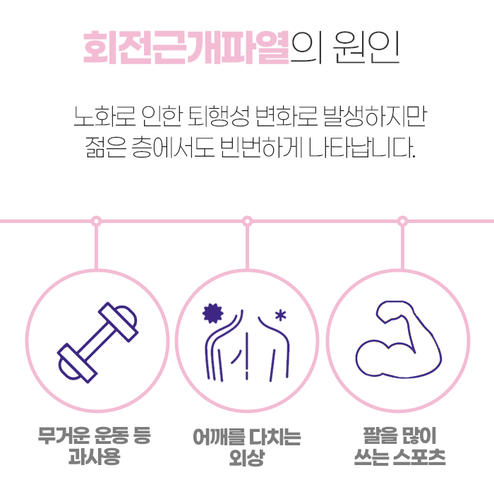 또한, 어깨의 힘이 약해지고 팔을 움직일 때 뻣뻣한 느낌이나 소리가 나기도 합니다. 증상이 심해지면 팔을 특정 방향으로 올리거나 움직이는 것이 매우 어려워지며, 이로 인해 생활에 큰 제약이 따릅니다. 회전근개파열의 주요 원인으로는 노화로 인한 퇴행성 변화, 반복적인 어깨 사용, 과도한 사용으로 인한 미세한 손상, 그리고 외상에 의한 충격 등이 있습니다. 나이가 들면서 회전근개의 힘줄이 약해지고 탄력을 잃어 작은 충격에도 쉽게 파열될 수 있습니다. 또한, 야구, 테니스, 배드민턴 등의 스포츠를 자주 하는 사람들, 무거운 물건을 드는 직업군에서는 파열의 위험이 더 높습니다. 뿐만 아니라, 넘어지거나 사고로 인해 어깨에 충격이 가해질 경우 회전근개가 손상될 수 있습니다.