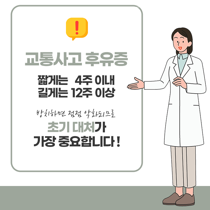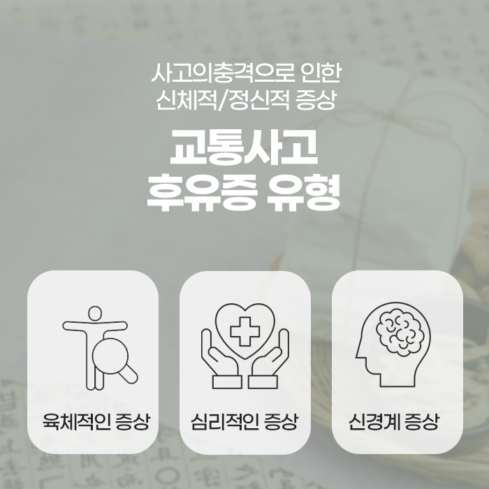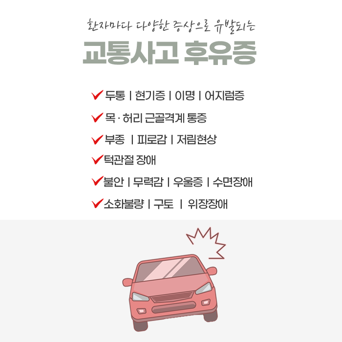 교통사고는 신체적인 외상의 문제에 그치지 않으며, 정신적, 신경학적, 소화기적 문제를 포함한 복합적인 후유증을 초래할 수 있습니다. 사고 후 겉으로 보이는 증상이 없다고 해서 안심할 수 없으며, 사고 후 일정 기간 동안 신체 상태를 면밀히 살피고 치료를 받는 것이 중요합니다.