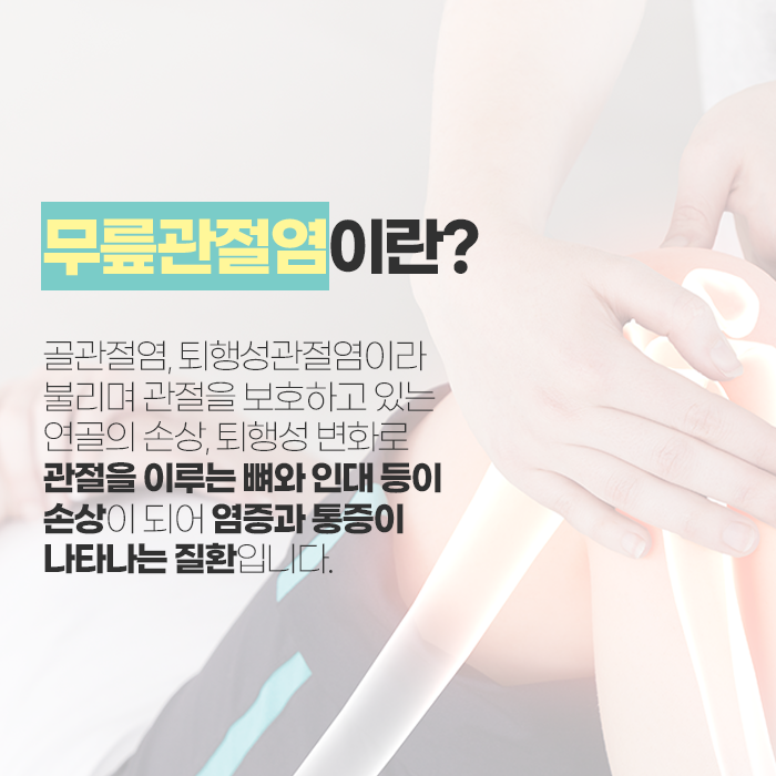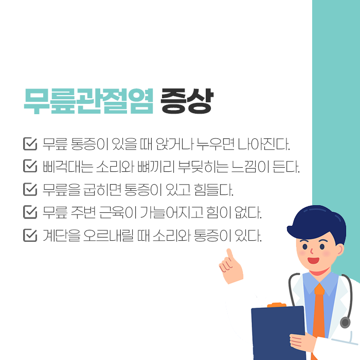 관절염으로 인한 통증은 점차적으로 발생하고, 무릎 주위에 붓기가 동반될 수 있습니다. 자가 진단으로는, 무릎에 통증이 있을 때 쉬면 일시적으로 나아지거나, 삐걱거리는 소리나 뼈끼리 부딪히는 느낌을 받을 수 있습니다. 또한 무릎을 구부리거나 펴는 데 어려움을 느끼고, 그에 따른 통증이 발생합니다. 이와 함께 무릎 주변 근육이 약해지고 가늘어지며, 계단을 오르거나 내릴 때 통증과 소리가 동반될 수 있습니다. 퇴행성 관절염은 활동 후 통증이 심해지고, 특히 저녁이나 잠자기 전 통증이 심해지는 경향이 있습니다. 날씨가 추워지거나 흐리면 관절 주위 근육과 인대가 수축되어 통증이 더욱 악화될 수 있습니다.