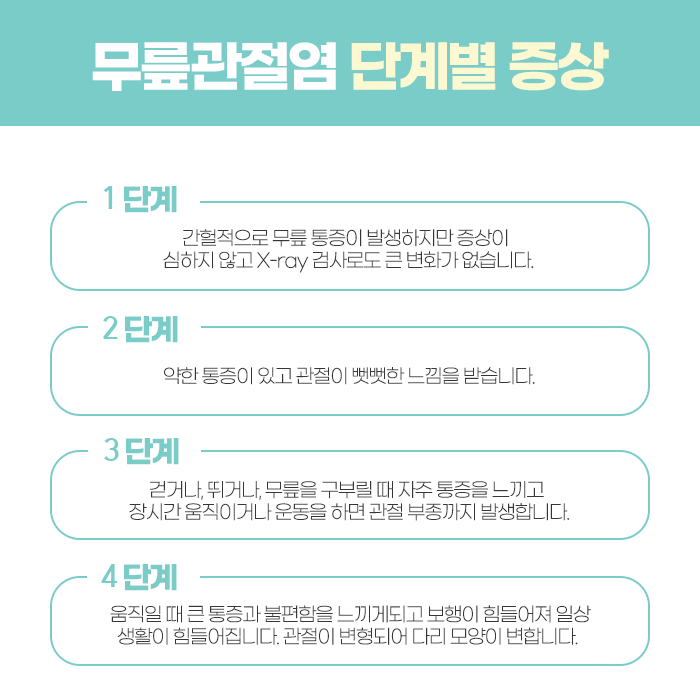 1단계: 무릎 통증이 간헐적으로 나타나지만 통증이 심하지 않고, 검사를 받아도 큰 변화는 보이지 않습니다.