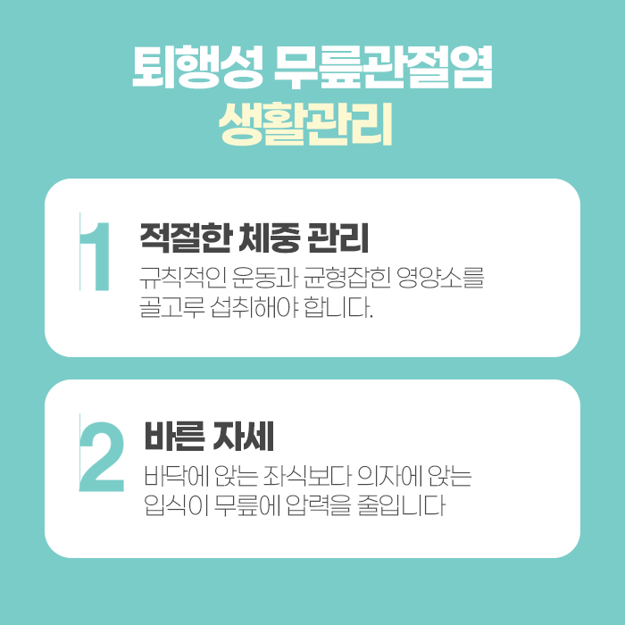 무릎 관절염의 치료 외에도 생활 속에서 할 수 있는 관리가 중요합니다. 체중이 과다하면 무릎에 부담을 주므로, 체중을 적정 수준으로 유지하는 것이 필요합니다. 또한, 좌식 생활보다 의자에 앉는 입식 생활을 통해 무릎에 가해지는 압력을 줄이는 것이 좋습니다. 규칙적인 운동과 균형 잡힌 식사 또한 관절 건강에 중요합니다. 운동을 통해 관절 주변의 근력을 강화하고 유연성을 높이면 관절의 운동 범위가 유지됩니다. 특히 스트레칭을 꾸준히 하면 관절이 굳어 있는 것을 예방하고, 무릎의 기능을 유지하는 데 도움이 됩니다.