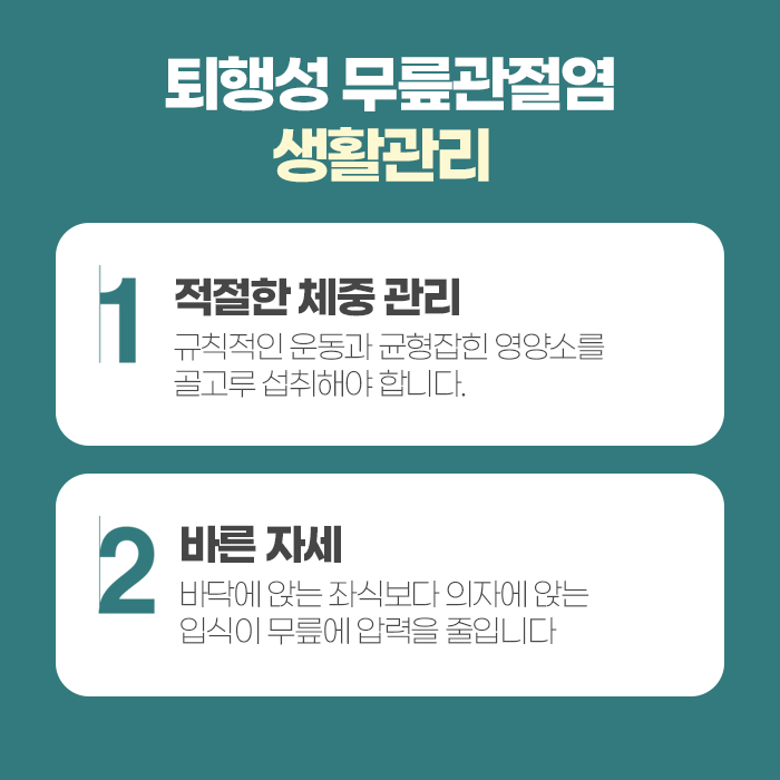 치료와 함께 생활습관 개선도 중요합니다. 과체중은 무릎에 과도한 부담을 주므로, 적절한 체중 조절이 필요합니다. 또한 쪼그려 앉기, 무릎 꿇기, 계단 오르내리기와 같은 무릎에 부담이 큰 동작은 피해야 하며, 무릎 근육을 강화하는 가벼운 스트레칭이나 걷기 운동은 증상 완화에 도움이 됩니다. 온찜질이나 반신욕 등으로 무릎 부위를 따뜻하게 해주는 것도 혈액순환을 도와 통증을 줄이는 데 효과적입니다.