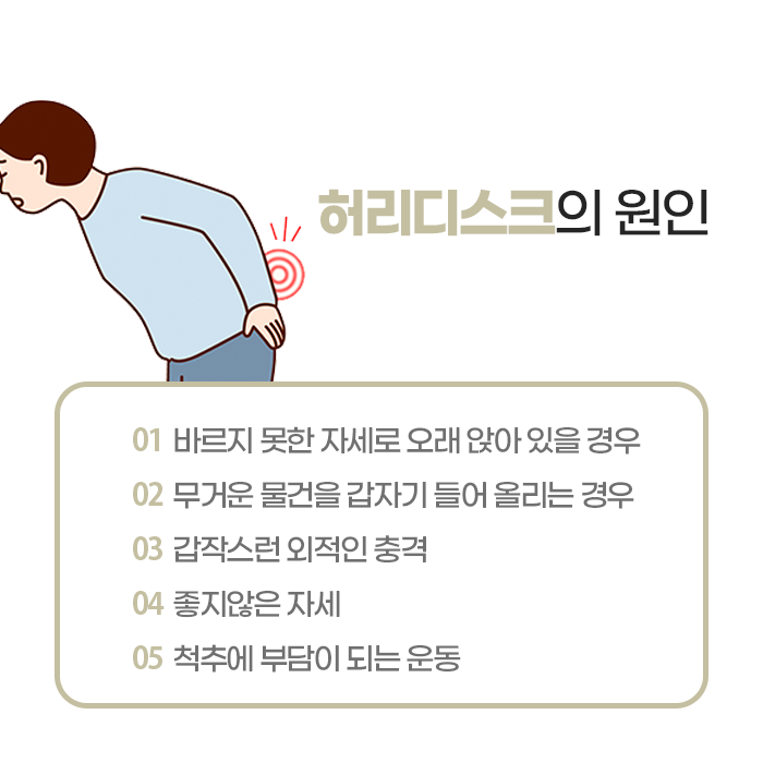허리 디스크는 척추 질환 중 하나로, 일상생활에서 자주 발생하는 문제입니다. 특히 현대 사회에서는 오랜 시간 앉아 있는 생활 습관이나, 무거운 물건을 자주 드는 직업, 장시간 운전하거나 서서 일하는 사람들이 흔히 겪는 질환입니다. 또한 반복적으로 허리를 구부리거나 장시간 앉아 있는 일들이 허리 디스크의 원인으로 작용할 수 있습니다. 디스크는 추간판의 수핵이 섬유륜을 뚫고 나와 신경을 압박하면서 통증과 염증을 일으키는 상태를 의미합니다.