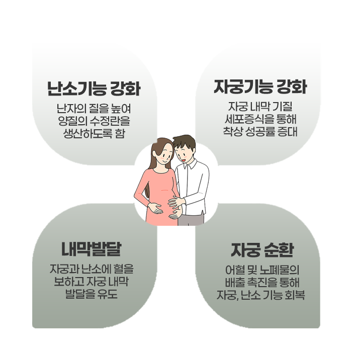 한약, 침, 뜸, 부항, 약침, 추나요법 등 다양한 치료 방법이 활용됩니다. 한약은 자궁과 난소의 기혈 순환을 돕고, 월경 주기를 조절하는 데 효과적입니다. 또한, 냉증, 소화불량, 수족냉증 등을 개선하여 임신에 적합한 환경을 조성하는 데 도움을 줍니다.