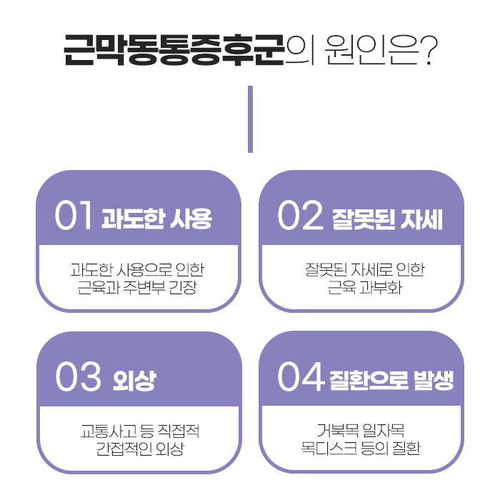 이외에도 스트레스, 수면 부족, 정서적 긴장감은 근육의 이완을 방해하여 통증을 유발하거나 증상을 악화시킬 수 있습니다. 특히 마음의 긴장이 신체에 영향을 미치는 경우, 근육이 지속적으로 수축된 상태가 유지되면서 쉽게 피로해지고 회복이 더뎌질 수 있습니다.