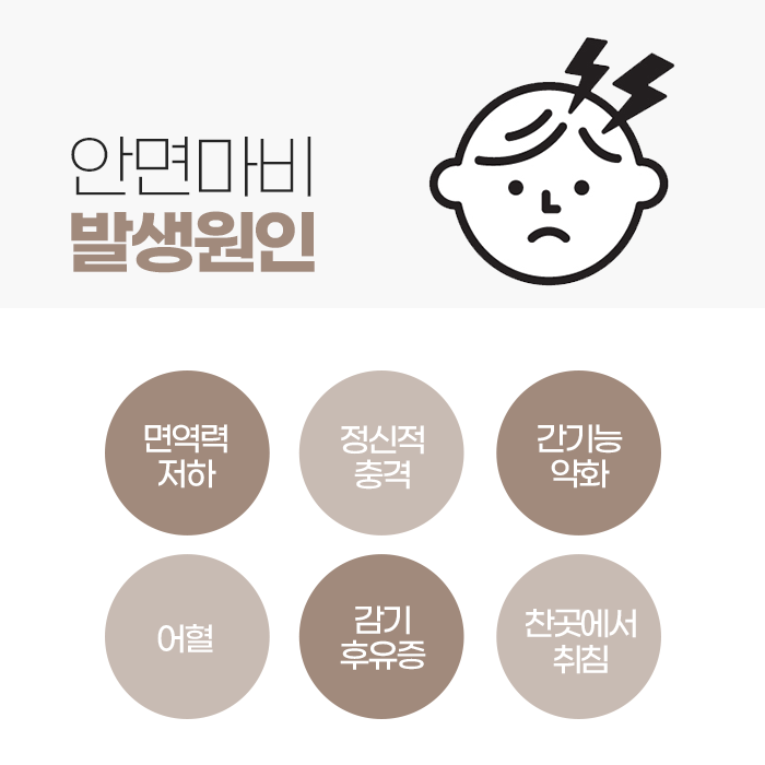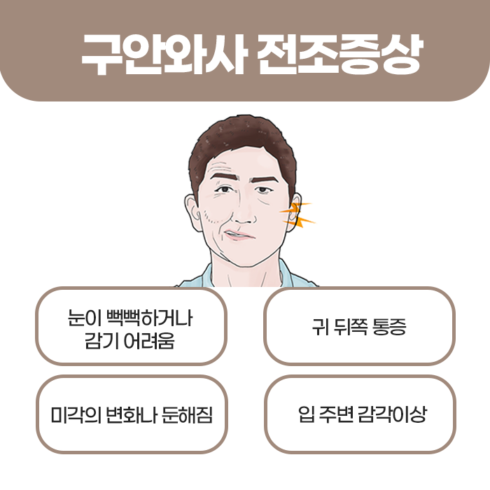 구안와사의 주된 원인은 바이러스 감염입니다. 특히 단순 포진 바이러스나 대상포진 바이러스가 면역력이 떨어진 틈을 타 활성화되어 안면신경에 염증을 일으키면서 증상이 생기는 경우가 많습니다. 이런 염증은 신경의 정상적인 기능을 방해해 얼굴 근육의 움직임을 제한하며, 눈을 감는 동작이 어렵거나 음식을 씹을 때 입에서 음식물이 새는 현상, 말이 부정확해지는 증상을 동반할 수 있습니다. 귀 주변의 통증, 미각 변화, 눈물 분비 이상, 청각 민감성 증가 등 다양한 증상도 함께 나타나 생활에 큰 불편을 주기도 합니다.