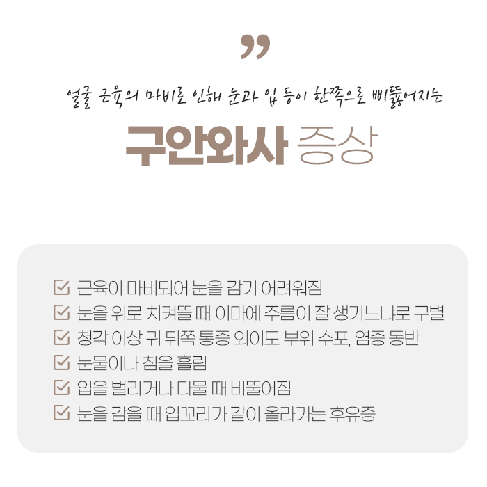 초기부터 재발 방지를 위한 생활 습관 관리도 병행해야 하며, 충분한 수면과 영양 섭취, 체온 유지, 스트레스 관리 등이 치료 효과를 높이는 데 큰 도움이 됩니다. 구안와사 환자는 치료 기간 동안 무리한 움직임을 삼가고, 얼굴 근육에 과도한 긴장을 주지 않는 것이 중요합니다.