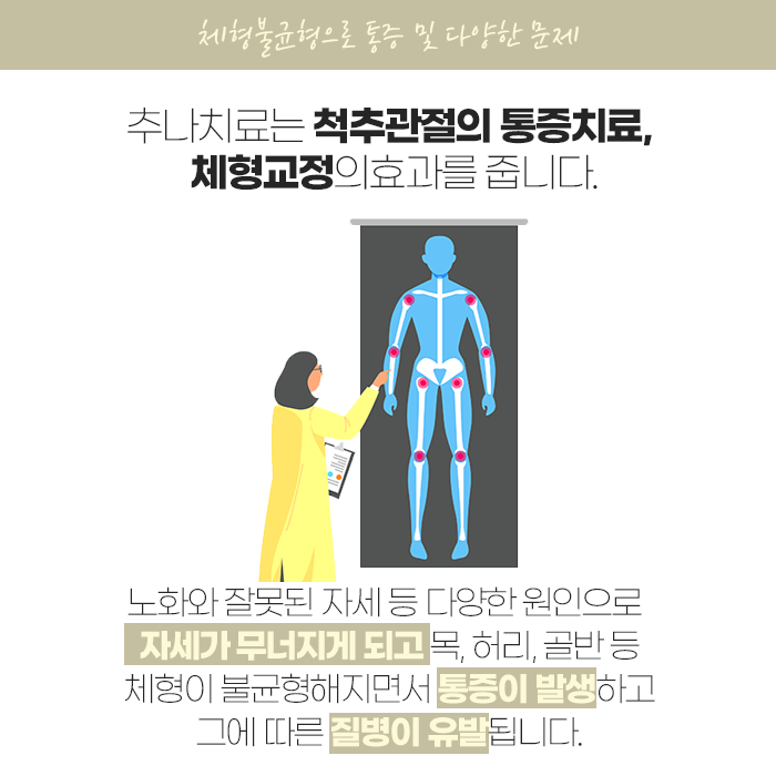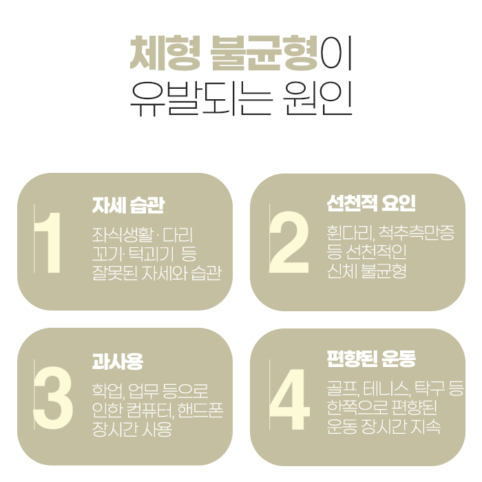 체형 불균형은 단순히 겉으로 보이는 문제가 아니라 신체 기능 전반에 큰 영향을 미치는 중요한 건강 이슈이므로, 조기에 인지하고 적절한 치료와 꾸준한 관리를 병행하면 통증 완화, 운동 기능 개선뿐 아니라 전반적인 삶의 질 향상도 기대할 수 있습니다.