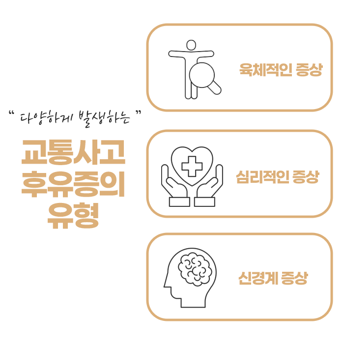 육체적인 증상 외에도 사고로 인한 정신적 충격도 무시할 수 없습니다. 사고 후 불안정한 감정이나 쉽게 놀라는 상태가 지속될 수 있으며, 잠을 깊이 자지 못하거나 무기력감을 느낄 수 있습니다. 사고 당시의 기억이 자주 떠오르거나 불안감이 심해져 대인 관계에 어려움을 겪는 경우도 있습니다. 이럴 때는 신체뿐 아니라 정서적인 안정도 함께 고려해야 합니다.