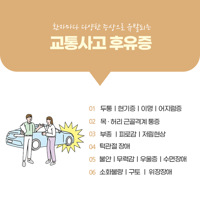 교통사고 후에는 위장 관련 증상도 발생할 수 있습니다. 사고로 인해 자율신경계에 영향을 주어 소화 기능이 저하되고, 속 불편, 구역감, 식욕 부진 등이 나타날 수 있습니다. 또한, 사고 당시의 충격이 목 주변 혈관이나 신경에 미세한 손상을 주어, 혈류의 불안정으로 어지럼증이나 두통이 발생할 수 있습니다. 이로 인해 집중력 저하나 시야 흐림, 이명 등의 증상이 나타날 수 있으며, 일상적인 생활에 불편함을 줍니다.