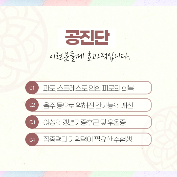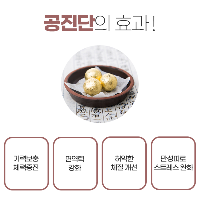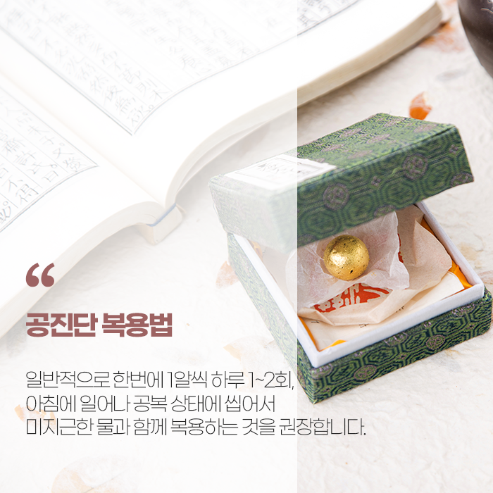 정신적 스트레스나 만성피로, 선천적으로 허약한 체질을 가진 사람에게도 공진단은 매우 효과적입니다. 신경이 예민하거나 운동량이 부족한 여성에게도 도움이 되며, 집중력 저하, 식욕 부진, 피부혈색 불량, 두통, 구내염, 산후 수족냉증 등 여러 증상에 효능이 있습니다. 보통 하루에 1환 또는 1/2환을 두 번 나누어 복용하며, 식사 전후와 관계없이 복용 가능합니다.