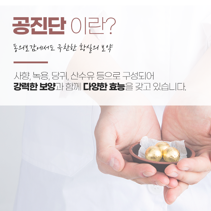 공진단의 주요 원료는 사향, 녹용, 당귀, 산수유로, 한의사의 재량에 따라 약재의 종류와 함량은 달라질 수 있습니다. 사향과 녹용을 적절히 배합하여 신장의 기운을 보강하고, 양기를 머리에서 내려주어 몸의 균형을 맞춰줍니다.