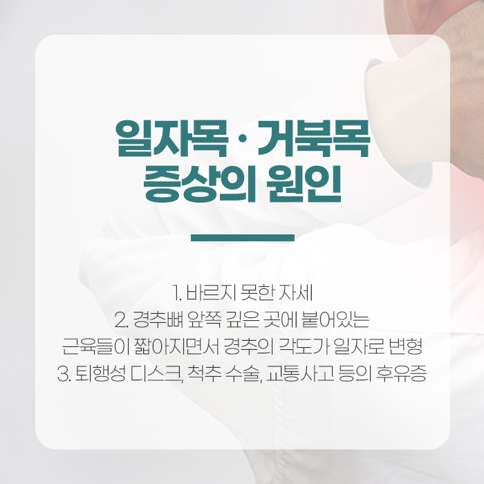 그러나 장시간 고개를 앞으로 숙이는 자세가 반복되면, 경추의 곡선은 점점 사라지고 목뼈가 일자 형태로 펴지게 됩니다. 이런 변화가 누적되면 목뼈가 앞으로 툭 튀어나온 거북목으로 발전하며, 주변 근육과 인대, 신경에 과도한 부담이 가해지게 됩니다.이처럼 일자목이나 거북목으로 이어지는 주요 원인은 나쁜 자세의 반복입니다.