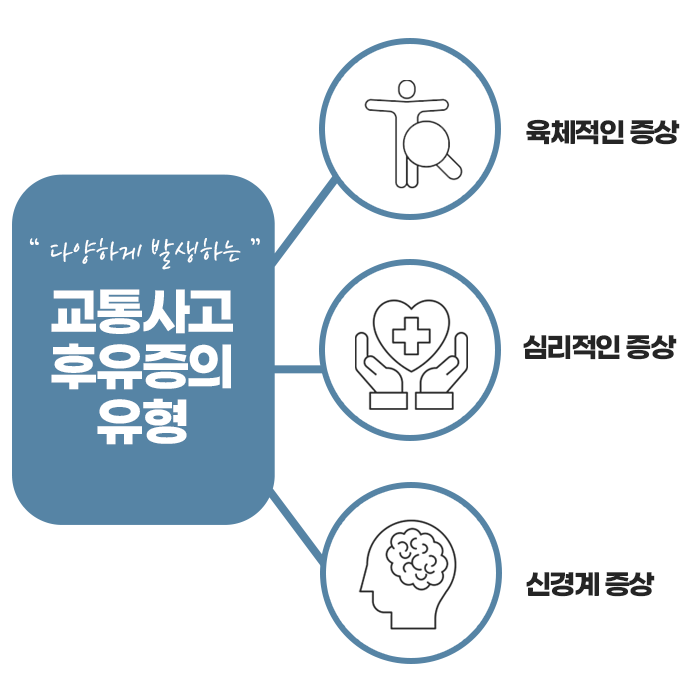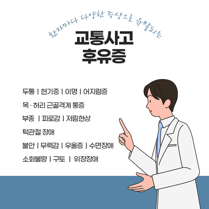 정신적인 후유증 역시 중요하게 고려해야 합니다. 사고 후 불안감이나 공포심, 우울감, 사고 장면이 반복적으로 떠오르는 외상 후 스트레스 증상 등이 나타날 수 있으며, 이로 인해 무기력함, 대인관계 어려움, 수면장애 등이 생길 수 있습니다. 따라서 신체적 치료와 함께 심리적 안정과 상담, 필요 시 정신 건강 치료를 병행하는 것이 회복을 돕습니다.
