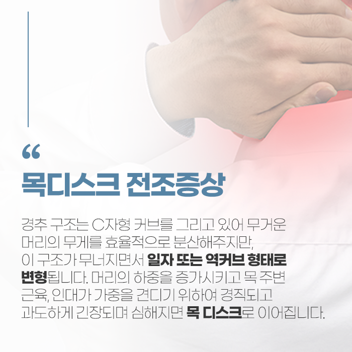 경추가 일자형으로 변형되면 단순한 목 결림이나 어깨 뻐근함을 넘어 디스크에 가해지는 압력이 증가하고, 이로 인해 디스크가 돌출되거나 탈출하며 신경을 압박할 가능성이 커집니다. 이때 목과 어깨, 팔에 통증과 저림, 손끝 감각 이상 등의 신경학적 증상이 나타날 수 있으며, 상체 중심이 앞으로 쏠리면서 척추 정렬이 무너지고 허리 통증, 골반 틀어짐, 무릎 통증 등 전신적인 문제로 확산될 수 있습니다.