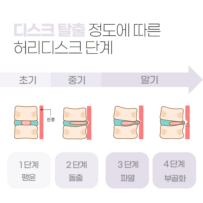 처음에는 디스크의 바깥쪽이 약간 손상되며 가벼운 불편감이 느껴지지만, 일상생활에는 큰 지장이 없습니다. 중기에는 디스크가 더 크게 돌출되면서 신경을 직접 누르기 시작해, 허리뿐 아니라 다리까지 저리는 증상이 나타납니다. 말기에 이르면 디스크가 완전히 탈출하고 신경 손상이 발생하여, 걷기 어려움이나 마비 증상으로 이어질 수 있습니다.