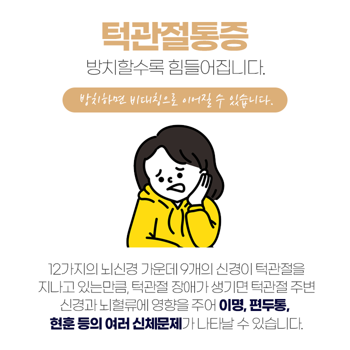 턱관절 문제는 단순한 일시적 통증이 아니라 전신 건강과도 직결된 문제입니다. 턱관절은 음식 씹기, 말하기, 표정 짓기, 심지어 수면과 집중력에도 영향을 미칩니다. 턱관절 장애는 삶의 질에 큰 영향을 미치기 때문에, 증상이 나타날 때 즉시 관심을 갖는 것이 중요합니다. 만약 방치하면 턱관절 주변 근육이 과도하게 긴장해 만성 통증으로 이어지고, 심하면 턱이 잘 움직이지 않는 잠김 현상이나 관절염, 디스크 손상 등 더 심각한 문제로 발전할 수 있습니다. 특히 스트레스가 많은 현대인에게서 턱관절 장애가 증가하는 추세여서, 정신적인 안정과 신체적 관리가 함께 이루어져야 합니다.