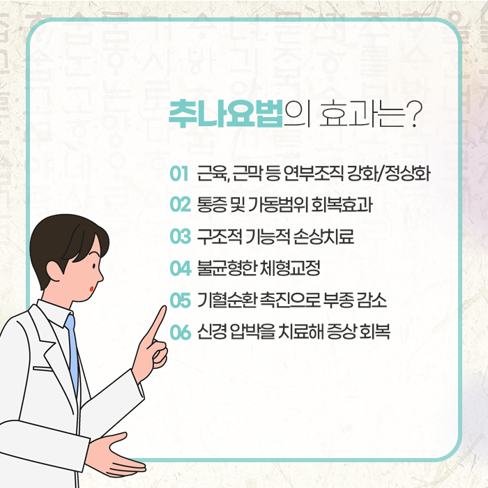 추나요법은 단순히 뼈를 맞춘다는 개념이 아닙니다. 몸 전체의 기혈 순환과 신경 흐름을 정상화시켜 통증의 근본 원인을 해결하는 치료입니다. 척추가 바르게 정렬되면 신경 압박이 완화되고, 혈류가 원활해져 대사와 면역 반응이 활성화됩니다.